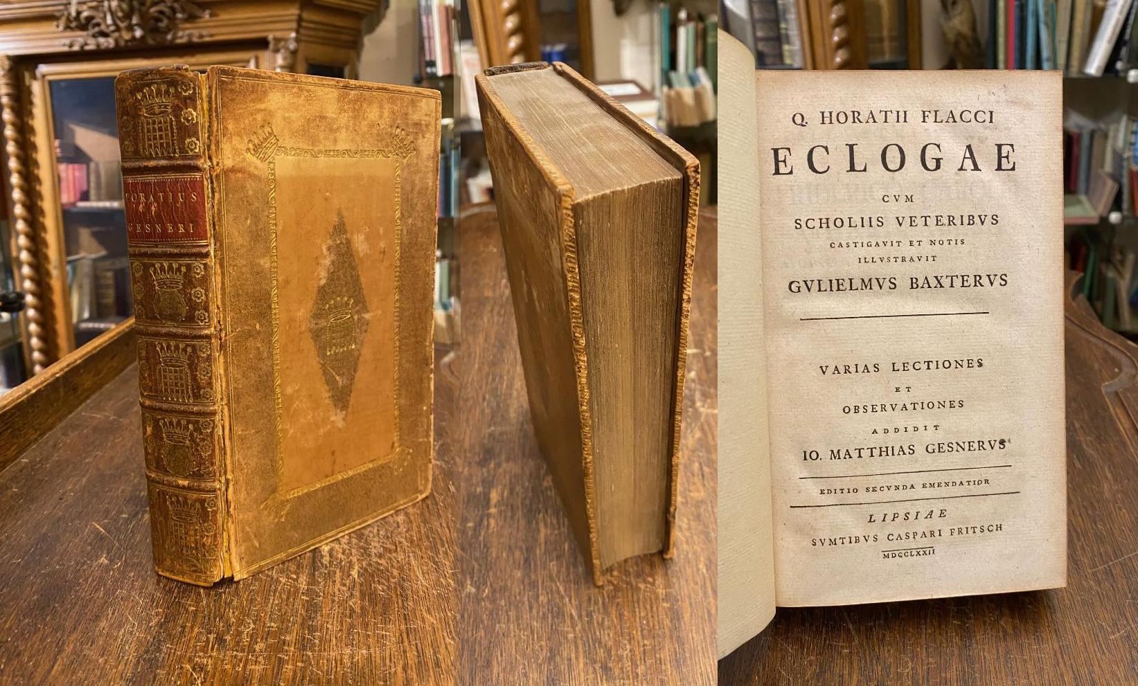 Horatius Flaccus, Quintus (65v-8v). – Baxter, William (1650-1723)/ Gesner, Johann Matthias (1691-1761): Q. Horatii Flacci Eclogae cum Scholiis Veteribus Castigavit Et Notis Illustravit Gulielmus Baxterus : Varias Lectiones Et Observationes Addidit Io. Matthias Gesnerus. Editio Secunda Emendatior. 2. Aufl., Lipsiae [Leipzig], Sumtibus Caspari Fritsch [Caspar Fritsch], 1772. 8° (20x13), 24 Bl., 636 S., 9 Bl., 1 wBl., Ldr d.Zt, Rückenschild, allseitig reiche goldPrägung mit Bekrönungen (wohl Adelsbibliothek), SeitenkantenVergoldung, marmorVorsätze, Rückenfalze gering verletzt, vordGelenk gering gelockert, Innenspiegel mit Schatten von entferntem Exlibris, Name auf flVorsatz, ordentliches, kaum genutztes Exemplar, [VD18 11525967].–