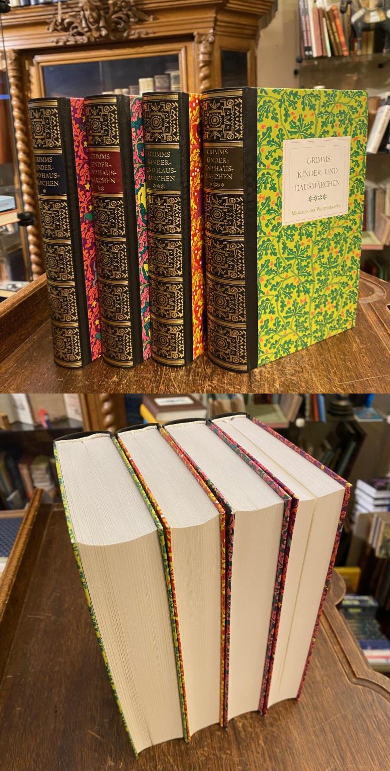 Grimm, Brüder: Kinder- und Hausmärchen [Kassette in vier Bänden] : Nach der Großen Ausgabe von 1857, textkritisch revidiert, kommentiert und durch Register erschlossen. Herausgegeben von Hans-Jörg Uther. (Lizenzausgabe mit Genehmigung des Diederichs Verlag, München), 4 Bände in 4 (so komplett). Darmstadt, WGB Wissenschaftliche Buchgesellschaft, (1996). 8° (19x12), 332; 352; 315; 416 S., OHln mit RVergoldung und farb Buntpapierbezug, ohne Gebrauchsspuren, wohl ungelesen, frisch, ohne Schuber, [= Märchen der Weltliteratur : begründet von Friedrich von der Leyen : herausgegeben von Hans-Jörg Uther], Band 1: Märchen 1-60.– Band 2: Märchen 61-144.– Band 3: Märchen 145-200, Kinderlegenden 1-10.– Band 4: Nachweise und Kommentare, Literaturverzeichnis.— Sämtliche Märchen der Gebrüder Grimm nach der letzten zu deren Lebzeiten erschienenen ‚Großen Ausgabe‘ von 1857. Textkritisch bearbeitet, mit einem ausfürlichen Nachwort zur Entstehungs- und Wirkungsgeschichte, umfangreichen Kommentaren zu jedem Märchen, großem Namen- und Sachregister, einem Wörterverzeichnis, einem Verzeichnis der Quellen, Beiträgen und Vermittler sowie einer Typologie der Märchen.–