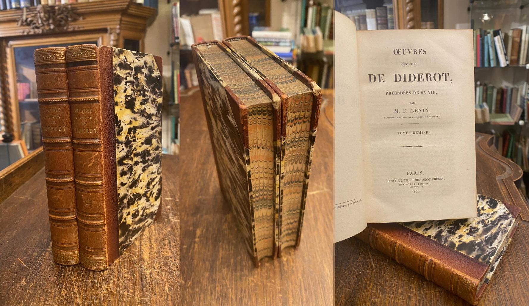Diderot, Denis (1713-1784). – Genin, Francois (1803-1856) (ed): Oeuvres choisies de Diderot, precedees de da vie, par M. F. Genin. Tome premier [et] Tome second [2 vol]. 2 vol, Paris, Librairie de Firmin Didot Freres, 1856. 8° (18x12), XCII, 341; 408 p., reliure d’epoche demi cuir, dos dore, feuilles de gardes et tranches marmorees, tres bon etat,