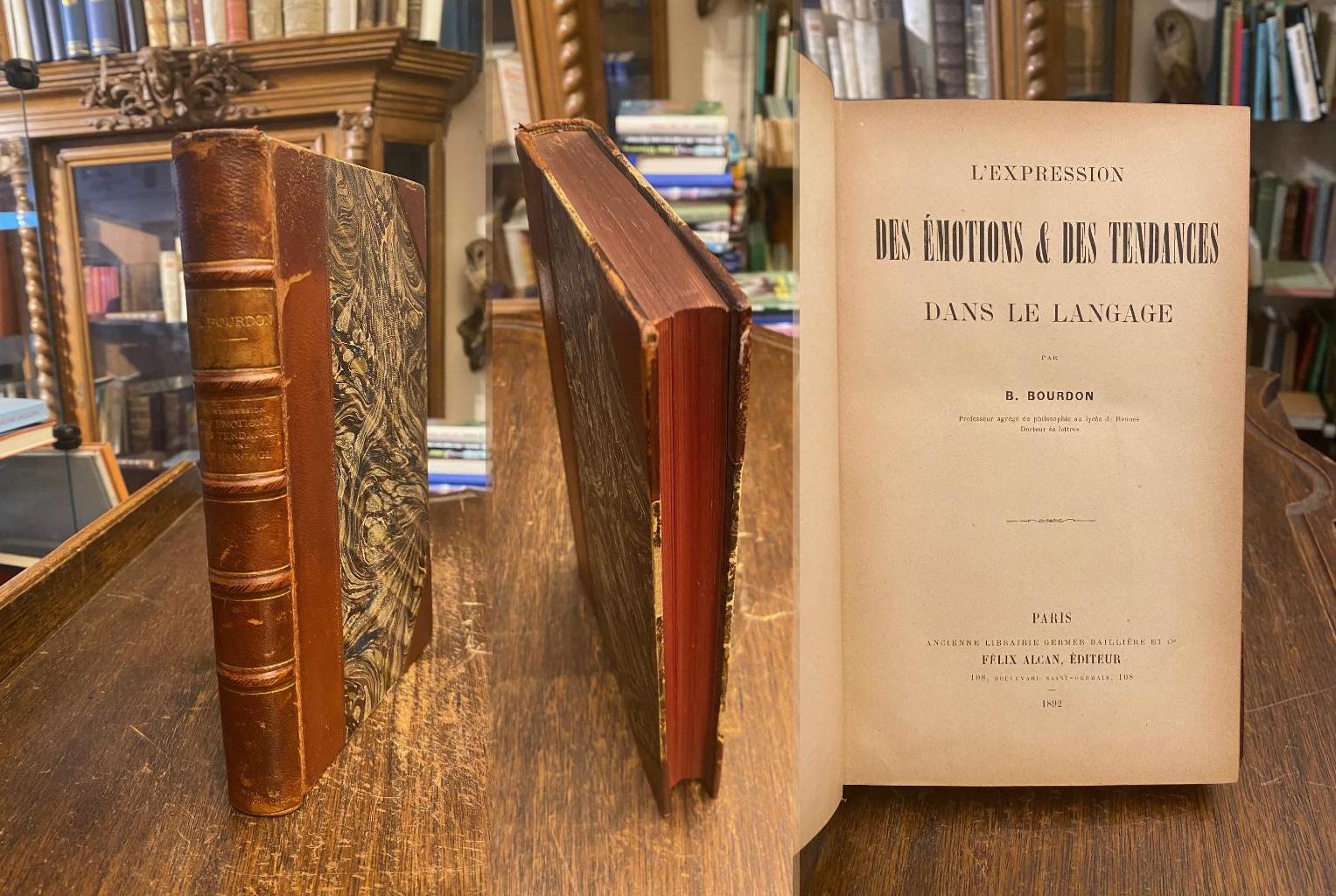 Bourdon, Benjamin (1860-1943): L’Expression des Emotions et des Tendances dans la Langage. (1. ed.), Paris, Felix Alcan Editeur, 1892. 8° (22x14), (IX), 374 p., reliure d’epoche demi cuir, dos dore, feuilles de gardes marmorees, tranches rouges, papier jauni, sinon propre et solide, tres bon,