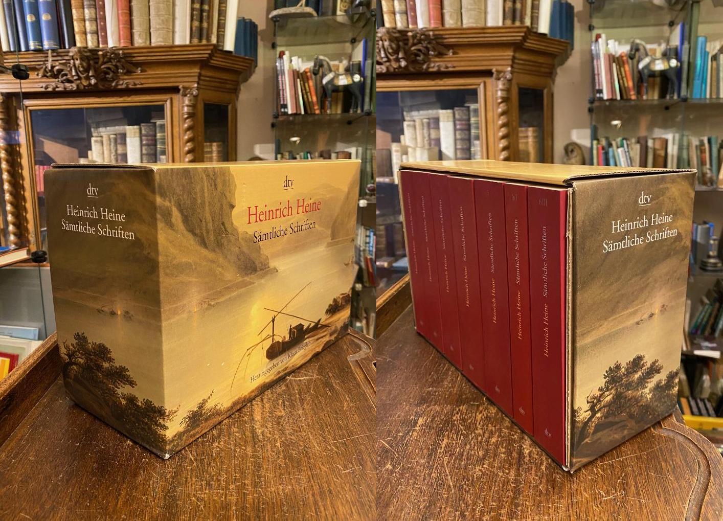 Heine, Heinrich (1797-1856). – Briegleb, Klaus (Hrsg): Heinrich Heines – Sämtliche Schriften [in sechs Bänden] (Kassette). 6 Bände in 7 (so komplett), Stuttgart, dtv Deutscher Taschenbuch Verlag, November 2005. 8° (19x12), 884; 968; 1038; 1062; 1103; 675; 918 S., 7 OKart (Brosch) im Schuber, kaum gelesen, sauber und wohlerhalten, Die Taschenbuchausgabe ist band- und seitenidentisch mit der im Karl Hanser Verlag, München erschienenen Ausgabe.–