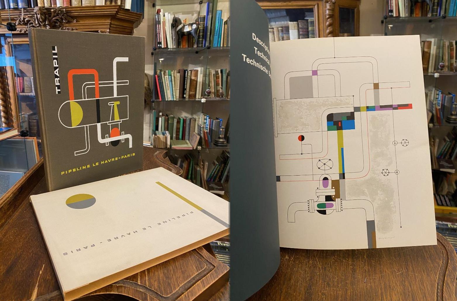 Trapil. – Georget, Guy (1911-1992) (ill): Pipeline Le Havre – Paris. Paris, TRAPIL : Societe des Transports Petroliers par Pipeline, Mai 1963. 4° (31x25), 58, (2) p., avec des photos et des tables illustree par Guy Georget, reliure d’editeur sous etui, Maquette de Guy Georget (1911-1992).– triligual : textes en francais – anglais – allemand.–