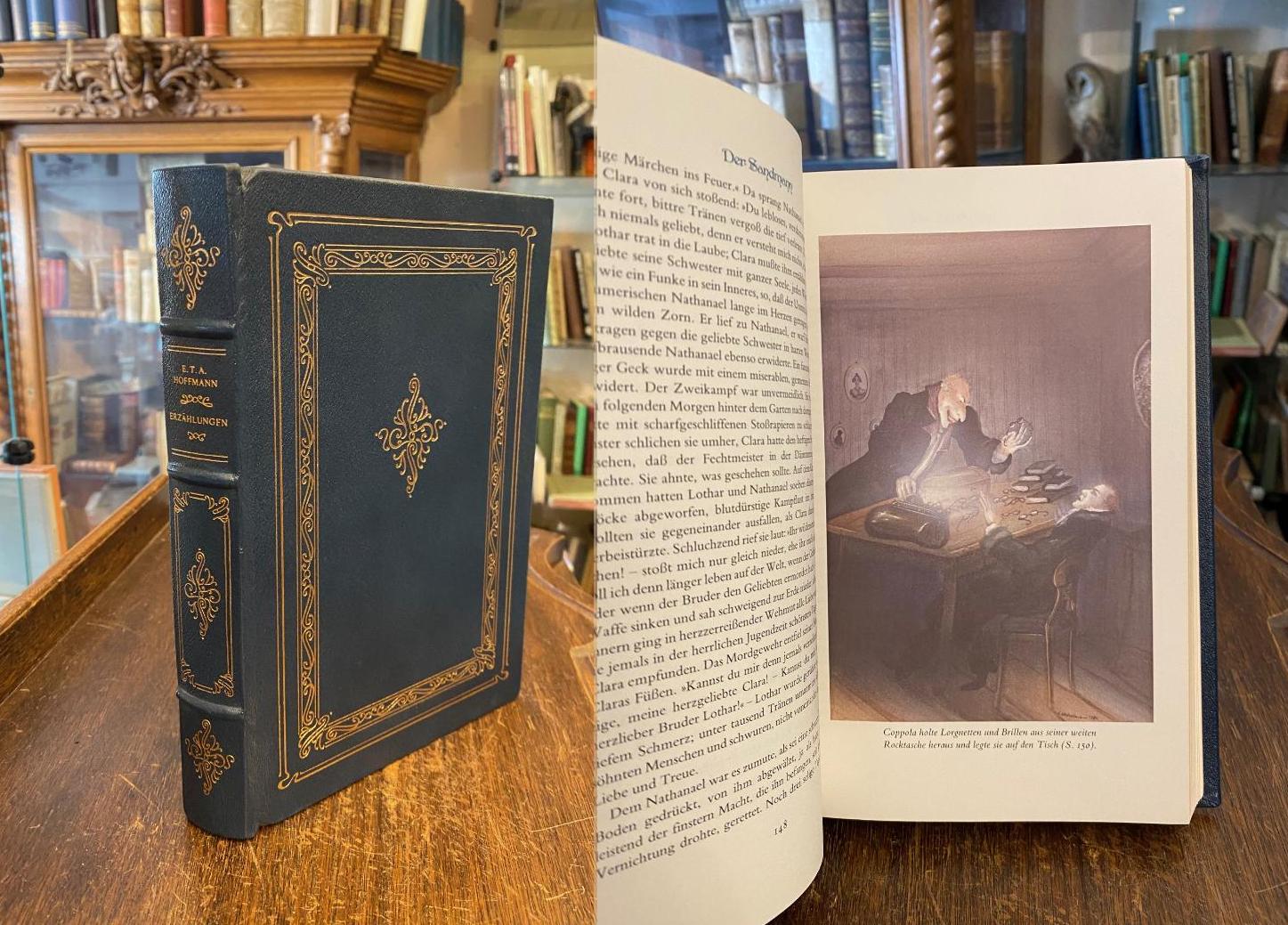 Hoffmann, ETA (Text) / Hechelmann, Friedrich (Ill): ETA Hoffmann : Erzählungen : Illustriert von Friedrich Hechelmann. Ottobrunn bei München, Franklin Bibliothek, 1981. gr8° (24x16), 466 S., mit 9 ganzseitigen Illustrationen, blaugrauer OKldr mit reicher goldPrägung, dreiseitiger Goldschnitt, MoireeVorsätze, Lesebändchen, ohne Gebrauchsspuren, wohl ungelesen, Die Illustrationen in diesem Band wurden von Friedrich Hechelmann exklusiv für Franklin Bibliothek geschaffen.– Vollständige Ausgabe nach dem Text der Erstdrucke unter Hinzuziehung der Ausgaben von Karl Georg von Maaßen und Georg Ellinger.–