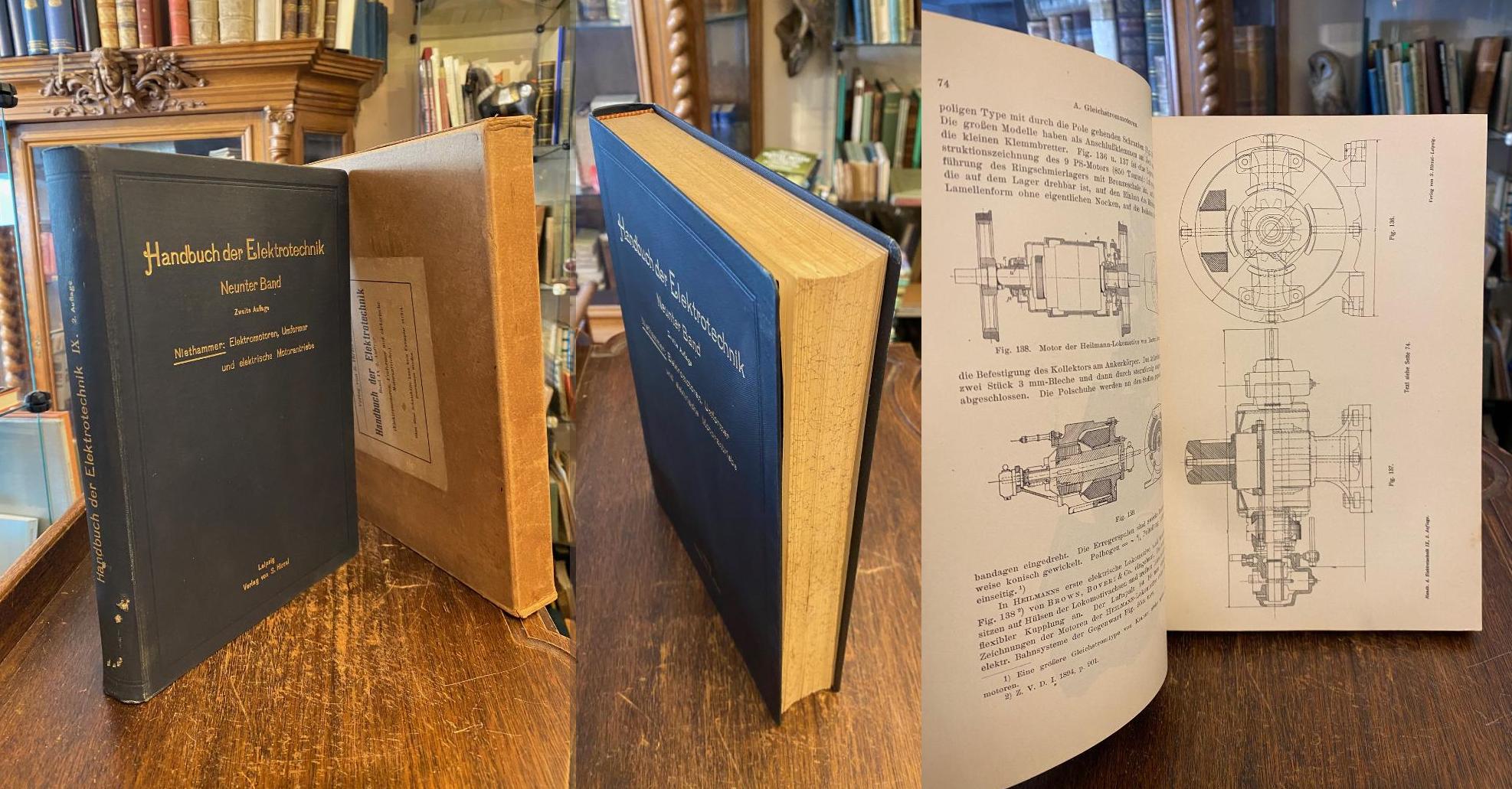 Heinke, Curt (Hrsg) / Niethammer, Friedrich: Handbuch der Elektrotechnik : Band IX.: Elektromotoren, Umformer und elektrische Motorantriebe. 2. Aufl., Leipzig, Verlag von S. Hirzel, 1910. 4° (28x20), XVI, 469 S., mit 604 Abb., darunter 25 Tafeln, dunkelblauer Oln (Kaliko) mit goldPrägung im Pappschuber, Rücken mit kleiner Bestossung, kaum gelesen, sauber und wohlerhalten, Schuber gealtert, [= Handbuch der Elektrotechnik; IX : herausgegeben von Curt Heinke],