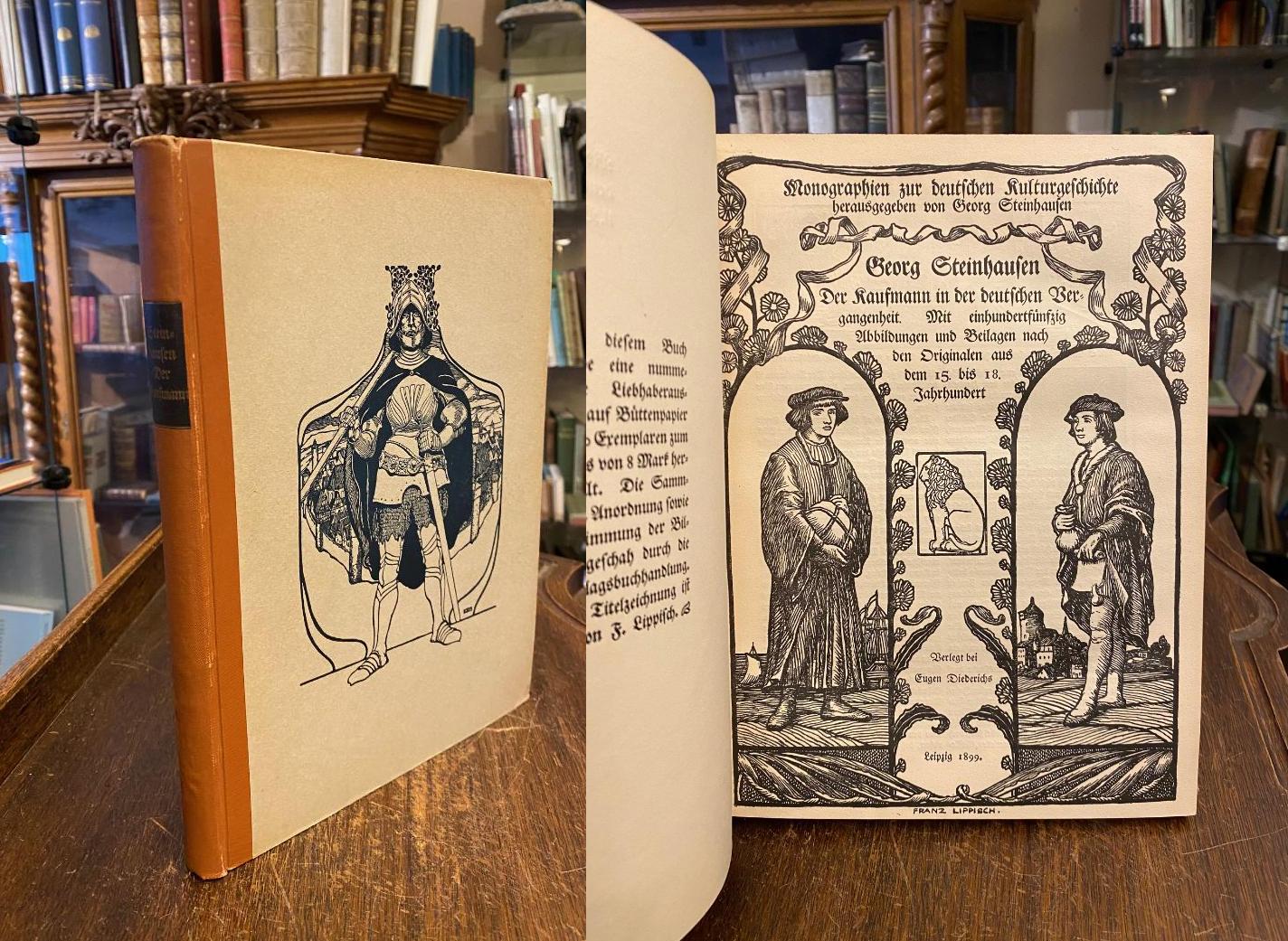 Steinhausen, Georg: Der Kaufmann in der deutschen Vergangenheit. Mit einhunderteinundfünfzig Abbildungen und Beilagen nach den Originalen aus dem 15. bis 18. Jahrhundert. Jena, Verlag von Eugen Diederichs, 1899. 4° (27x20), 131 S., mit 151 Abb. im Text und auf teils gefalteten Tafeln, OHln mit Rückenschild und Deckelillustration, gering gebräunt, kaum gelesen, sauber und wohlerhalten, [= Monographien zur deutschen Kulturgeschichte; 2 : herausgegeben von Georg Steinhausen], Titelillustration von Franz Lippisch.–