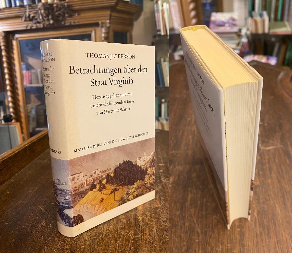 Jefferson, Thomas: Betrachtungen über den Staat Virginia. Herausgegeben und mit einem einführenden Essay von Hartmut Wasser. Zürich, Manesse Verlag, 1989. kl8° (17x11), 495 S., mit Porträt, KartenVorsätze Oln mit ill OU, Lesebändchen, Umschlagrücken etwas lichtverfärbt, sonst ohne Gebrauchsspuren, frisch, [= Manesse Bibliothek der Weltgeschichte],