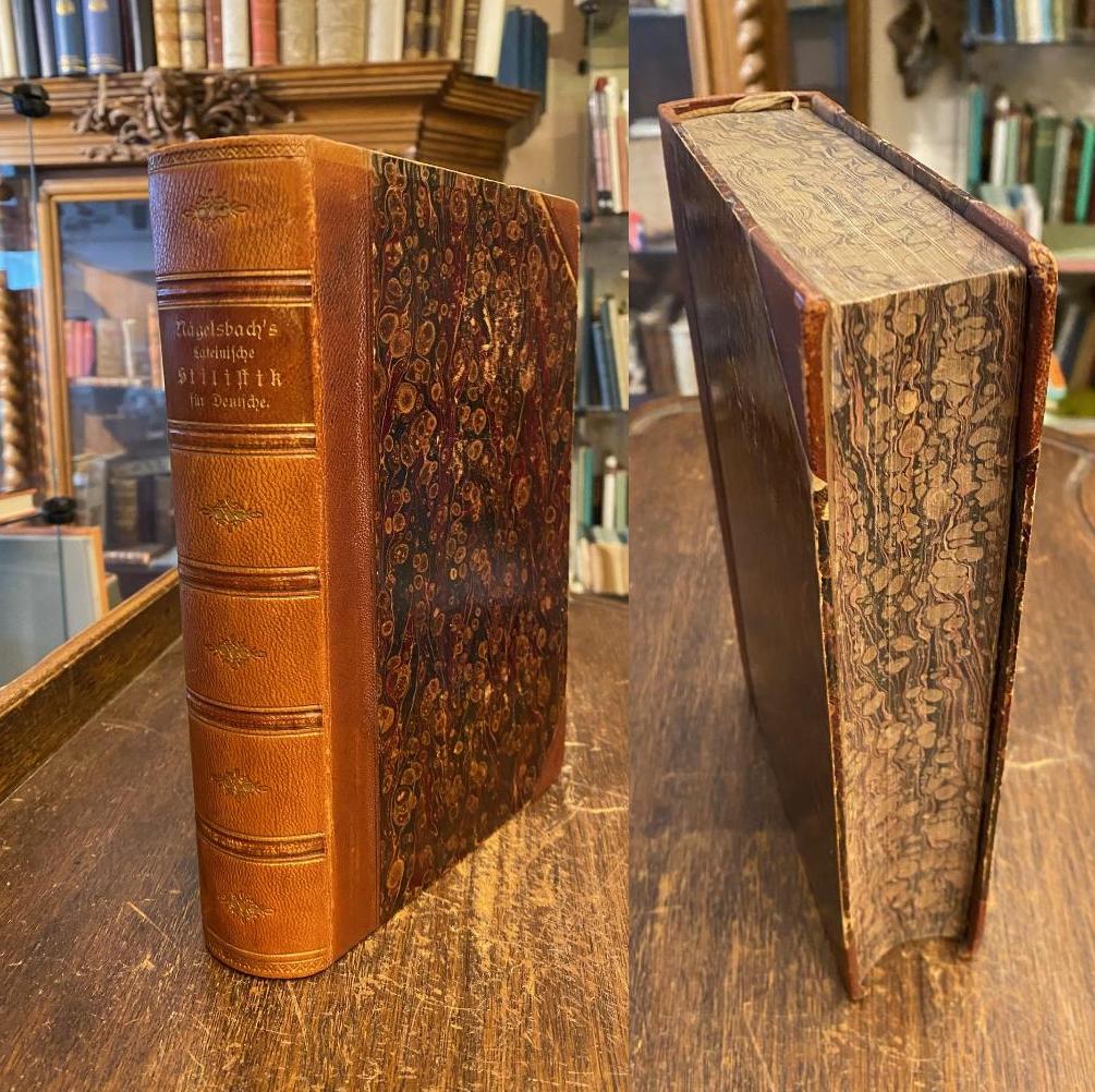 Nägelsbach, Karl Friedrich von / Müller, Iwan. Lateinische Stilistik für Deutsche. Achte Auflage besorgt von Dr. Iwan Müllel. 8. [revidierte] Aufl., Nürnberg, Verlag von Konrad Geiger, 1888. 8° (23x15), XXXII, 872 S., marmor OHldr mit LdrEcken, SchmuckVorsätze, Name auf flVorsatz, minimale Altersspuren, schönes Exemplar,