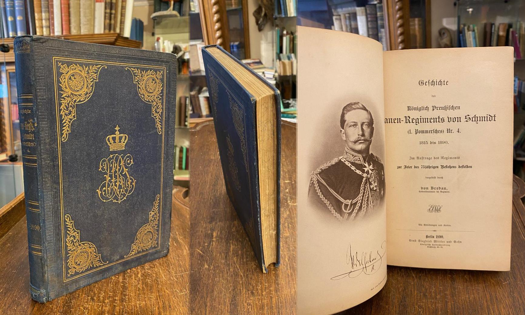 Bredau, [Hans Carl Curt Woderb] von : Geschichte des Königlich Preussischen Ulanen-Regiments von Schmidt (1. Pommersches) Nr. 4. 1815 bis 1890. Im Auftrag des Regiments zur Feier des 75 jährigen bestehens desselben dargestellt durch von Bredau, Sekondlieutenant im Regiment. Mit Abbildungen und Karten. Berlin, Ernst Siegfried Mittler und Sohn, 1890. 4° (25x17), VII, 148, 80 S., mit 3 Porträttafeln (Kaiser, Prinz Georg, Schmidt), 3 farb Uniformtafeln, 1 Schlachtenbild Königgrätz, sowie 2 mehrfach gefaltete Kartentafeln, [so komplett], blauer Oln gewachst mit goldPrägung auf Deckel und Rücken, SchmuckVorsätze, der Einband angeschmutzt und berieben, innen sauber und gut,