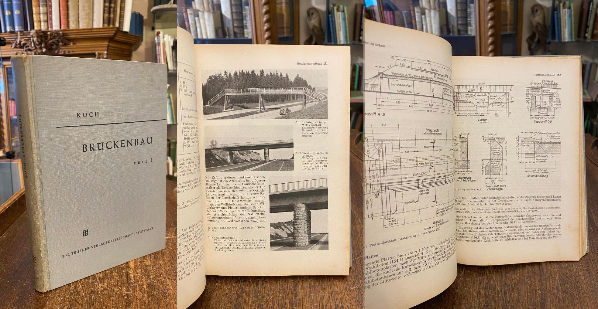 Koch, Werner: Brückenbau : Teil I: Planung der Brücken – Lastannahmen – Massivbrücken. Stuttgart, B.G. Teubner Verlagsgesellschaft, 1955. 8° (23x17), X, 320 S., 1 Bl., mit 306 Abb. und 52 Tafeln, OHln, gering angestaubt, Stempel einer Baufirma, Papier leicht gebräunt, fest sauber und gepflegt, [= Teubners Fachbücher für Hoch- und Tiefbau],