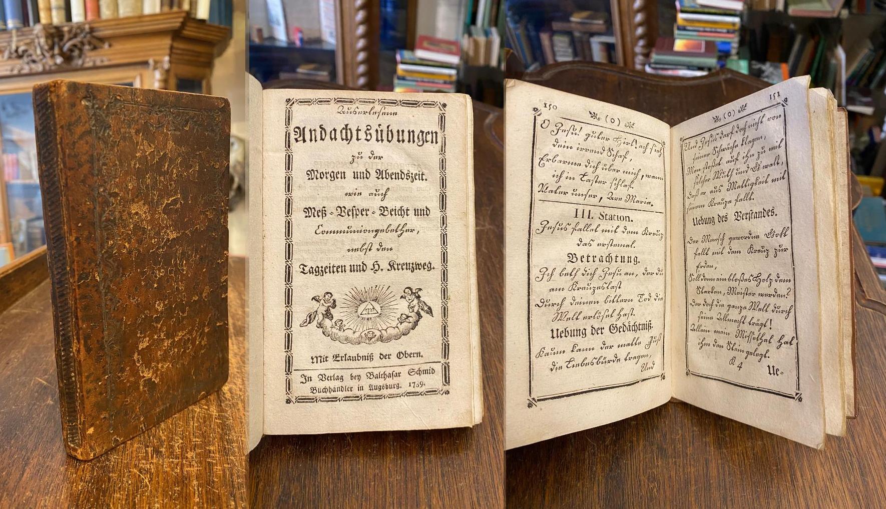 Auserlesene Andachtsübungen zu der Morgen und Abendzeit wie auch Meß– Vesper- Beicht udn Communiongebether, nebst den Tagzeiten und H. Kreuzweg. Augsburg, In Verlag bey Balthasar Schmid, 1789. kl8° (16x10), 182 S., durchgehend Kurrentschrift im Schmutzrahmen, brauner Ldr mit ornamentaler Filetten-Prägung, etwas berieben, Besitzvermerke auf Vorsatz, ein paar kleine Eckknicke, fest und sauber,